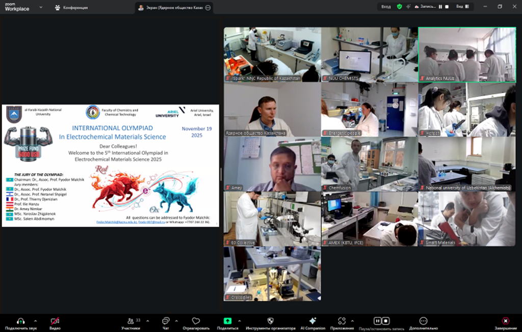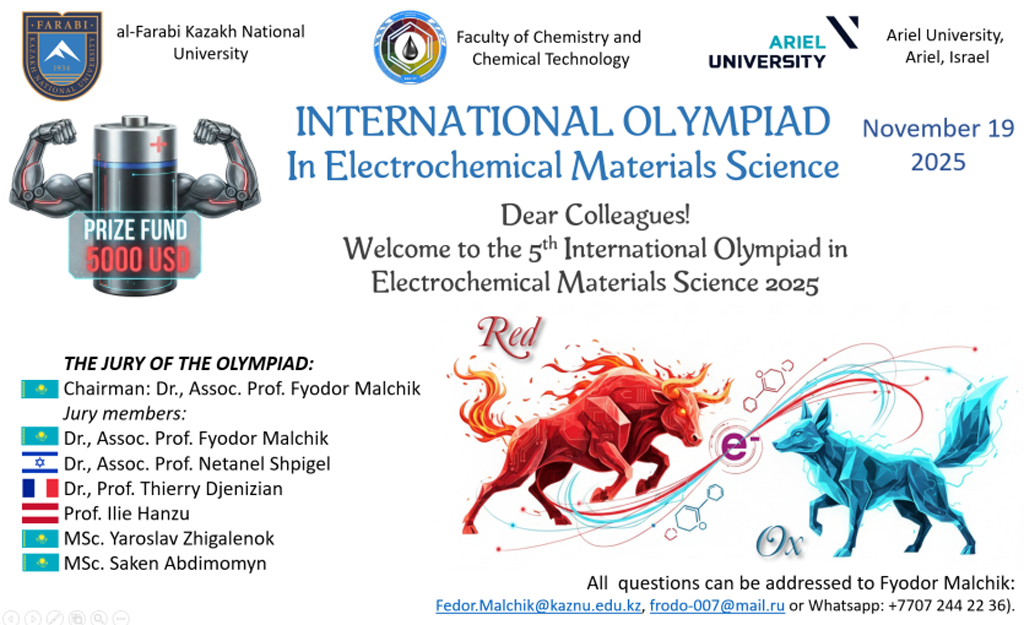 19-21 ноября 2025 г. при содействии Пагуошского комитета Казахстана при КазНАЕН состоялась «5-я Международная Олимпиада по электрохимическому материаловедению» (V- International Olympiad in Electrochemical Material Science). Организаторами и спонсорами Олимпиады выступили Лаборатория технологий электрохимических производств и кафедра аналитической и коллоидной химии и ТРЭ Казахского национального университета имени аль-Фараби.