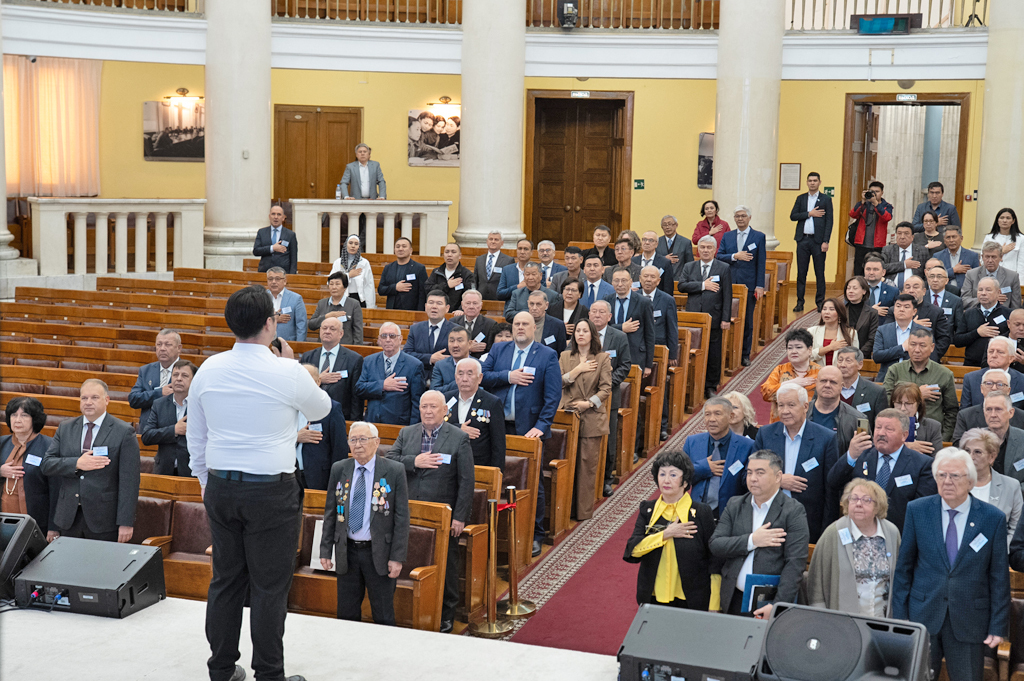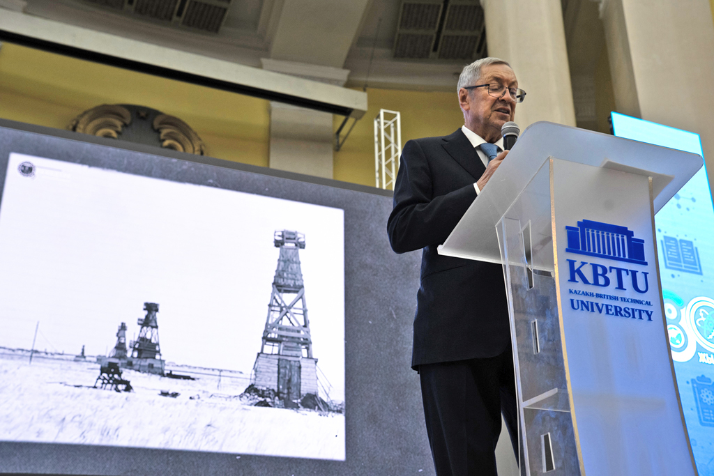 | Модератор торжественного собрания профессор КБТУ Ч.Лаумуллин, выступил с «Кратким обзором истории и значимости юбилейного события». |